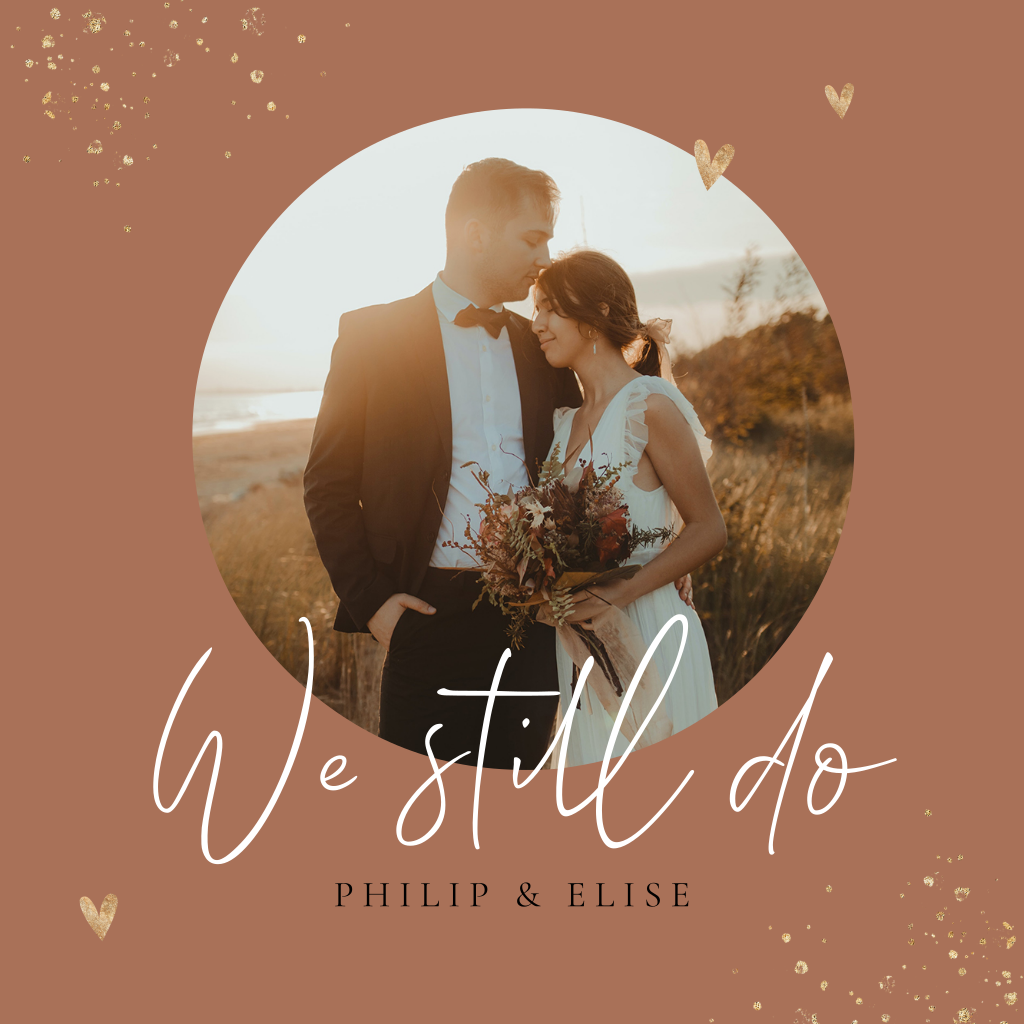 Een romantische uitnodiging voor jullie jubileumviering! Plaats een eigen foto in het ronde fotokader voorop, zoals een mooie trouwfoto. De goudlook spetters en hartjes geven deze uitnodiging een feestelijke uitstraling. In sierlijke letters staat voorop 'We still do'. Pas deze kaart eventueel aan in onze ontwerptool.