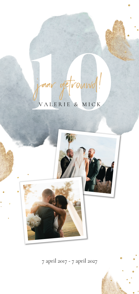 Zijn jullie tien jaar getrouwd? Van harte! Nodig jullie naasten uit voor een feestje met dit stijlvolle ontwerp met blauwe waterverf, foto's en goudlook details. Plaats twee mooie foto's van jullie trouwdag in de fotokaders voor een persoonlijk tintje. Benieuwd naar deze kaart? Bestel een proefdruk om deze uitnodiging in het echt te bewonderen.