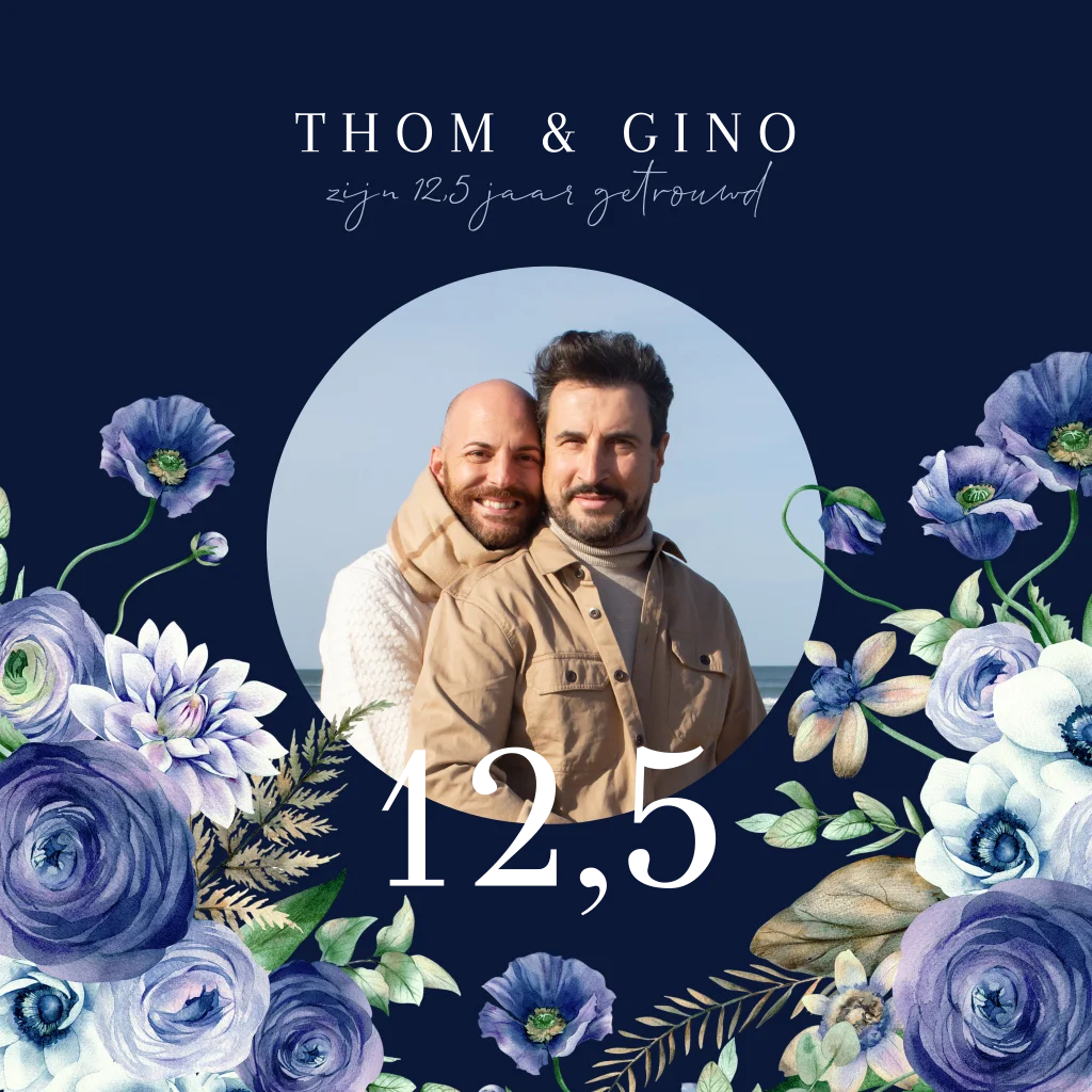 Vier jullie huwelijksjubileum van 12,5 jaar met deze prachtige uitnodiging met geschilderde, blauwe bloemen, een foto en glimmend koperfolie. Nodig al jullie naasten uit in stijl met dit persoonlijke kaartje. Pas zelf alle teksten aan in onze editor, voeg een eigen foto toe en bestel een proefdruk om deze uitnodiging in het echt te kunnen bewonderen.