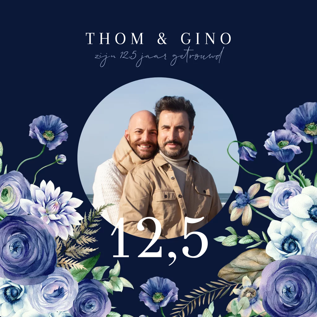 Vier jullie huwelijksjubileum van 12,5 jaar met deze prachtige uitnodiging met geschilderde, blauwe bloemen, een foto en glimmend goudfolie. Nodig al jullie naasten uit in stijl met dit persoonlijke kaartje. Pas zelf alle teksten aan in onze editor, voeg een eigen foto toe en bestel een proefdruk om deze uitnodiging in het echt te kunnen bewonderen.