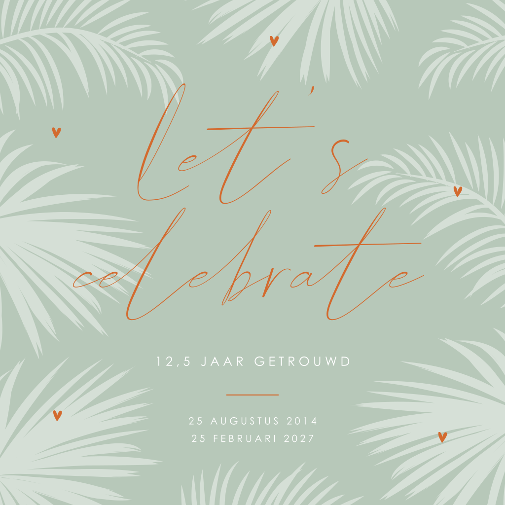 Tijd voor een feestje, jullie zijn 12,5 jaar getrouwd! Nodig jullie gasten uit met deze trendy uitnodiging in een zachtgroene kleur. De kaart staat vol grafische, tropische bladeren en wordt versierd door kleine roestbruine hartjes. In sierlijke letters staat 'let's celebrate' op de voorkant, ook in trendy roestbruin. Een stijlvolle kaart voor een mooi jubileumfeest!