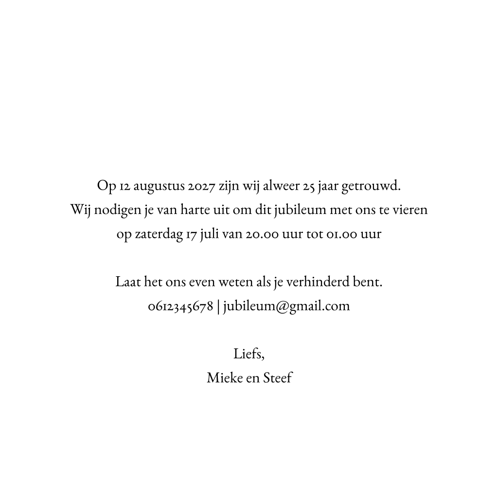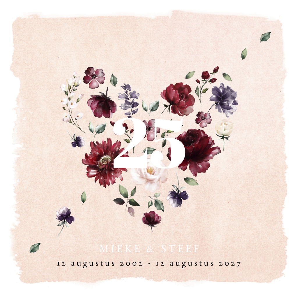 Goudfolie jubileum uitnodiging met hart van waterverf bloemen. Op zoek naar een klassieke uitnodiging voor jullie 25-jarig jubileum? Dit stijlvolle ontwerp heeft een zachtroze achtergrond en een hart met verschillende bloemen, geschilderd met waterverf. Het getal 25 wordt gedrukt met prachtig, glanzend goudfolie, wat zorgt voor een mooie finishing touch.