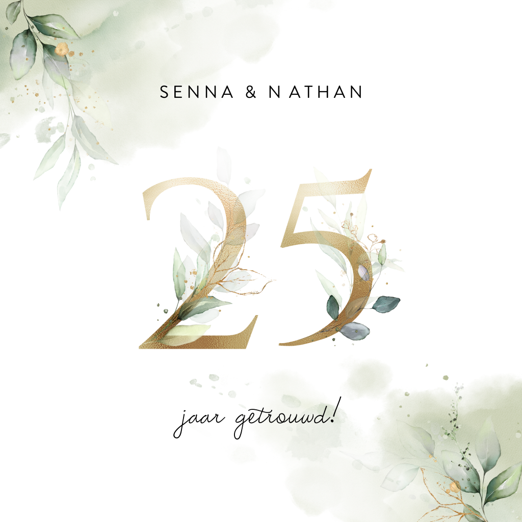 Gaan jullie binnenkort jullie huwelijksjubileum vieren, daar hoort natuurlijk een passende uitnodiging bij! Wat dachten jullie van dit chique ontwerp met botanische uitstraling? De kaart heeft groene waterverf vlekken op de achtergrond en botanische takjes met gouden details. Voorop staat groot jullie jubileum in gouden cijfers. Je kan de teksten zelf aanpassen in onze ontwerptool en natuurlijk ook de cijfers aanpassen.