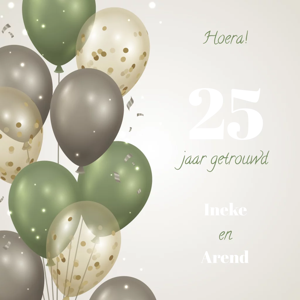 Een kwart eeuw samen verdient een groot feest! Stuur deze sprankelende uitnodiging met zilverfolie en vrolijke zilvergrijze en groene ballonnen naar al je vrienden en familie. De zilveren accenten zijn perfect voor jullie zilveren huwelijk. Personaliseer de teksten eenvoudig in onze handige editor en bestel daarna eerst nog een drukproef.