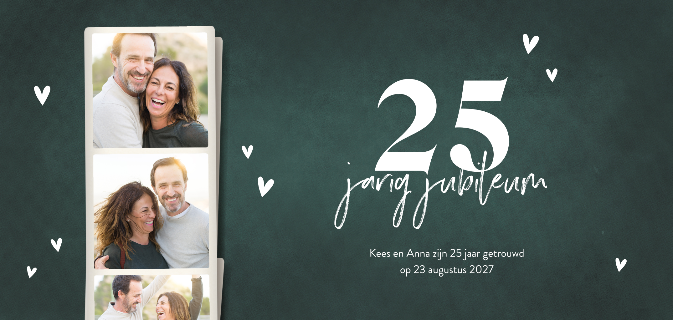 Mooie jubileum uitnodiging voor het vieren van de zilveren bruiloft. Dit toepasselijke ontwerp springt eruit door de foliedruk. De speelse typografie en kleine hartjes worden met een prachtige, zilveren glanslaag gedrukt. Pas de kaart naar wens aan in de ontwerptool en voeg drie foto's in de vintage fotostrip toe.