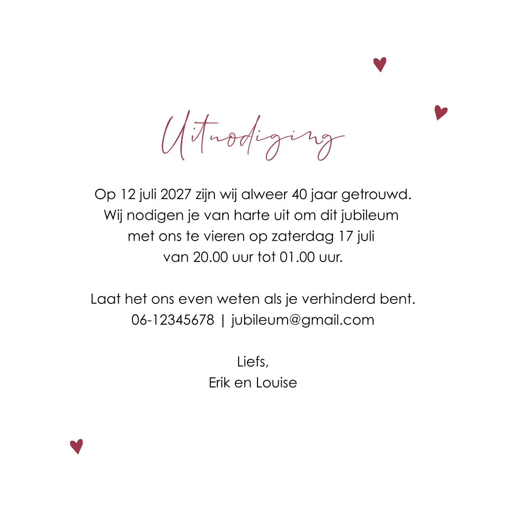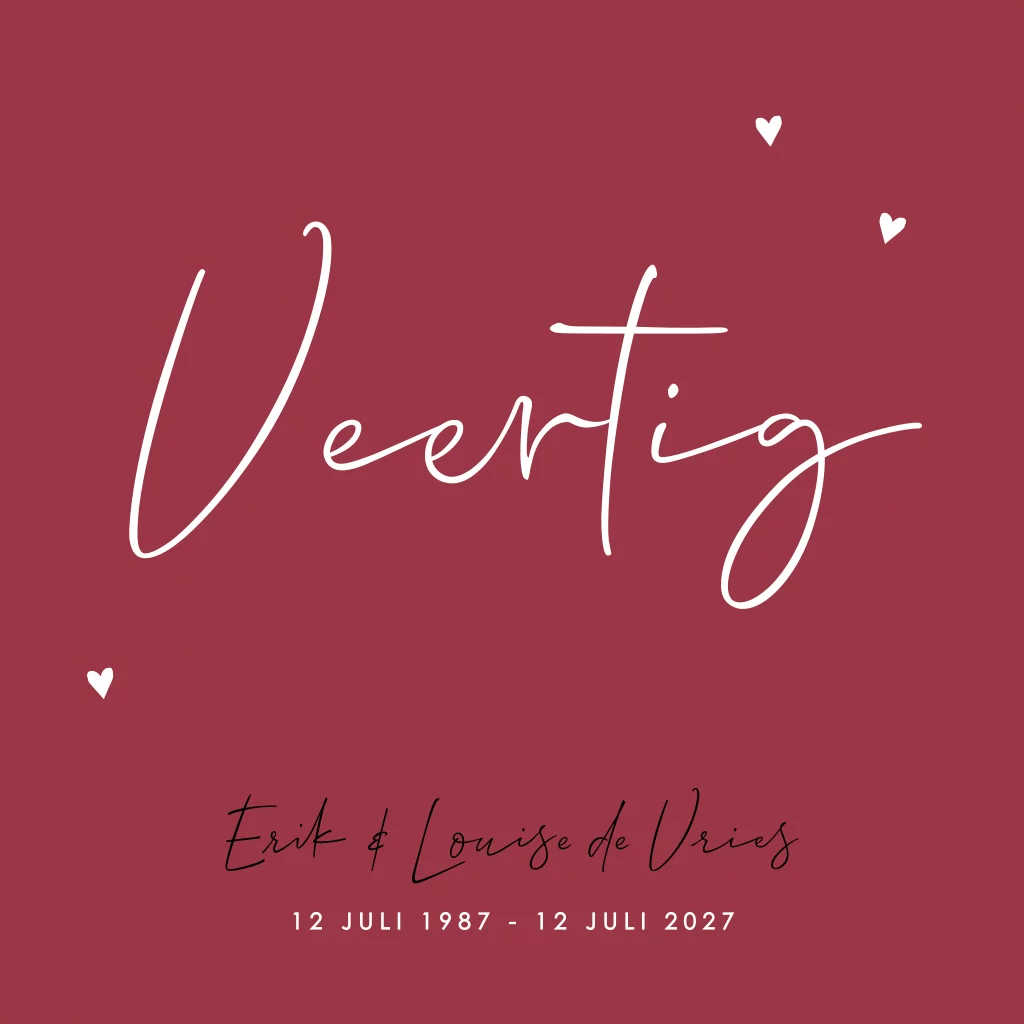 Op zoek naar een mooie uitnodiging voor jullie jubileum? Nodig jullie gasten uit met dit robijnrode ontwerp met witte typografie en hartjes. Op de voorzijde staat in grote, speelse letters 'veertig' geschreven, eromheen staat kleine hartjes. Aan de binnenzijde is ruimte voor een grote foto van jullie samen. Pas deze kaart eventueel verder aan in onze ontwerptool.