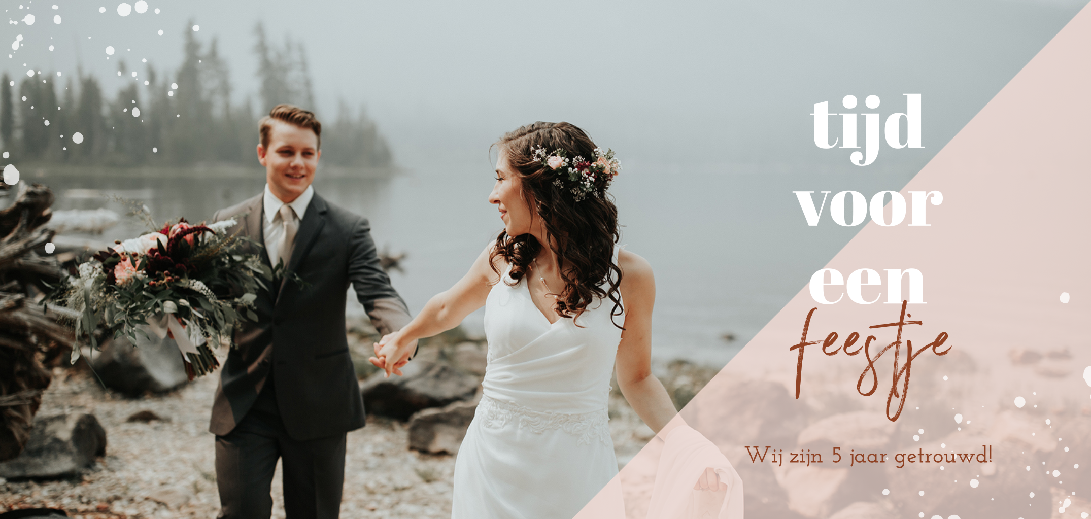 Nodig jullie vrienden en familie uit voor een jubileum feestje of diner met dit trendy fotokaartje. Plaats een grote foto, bijvoorbeeld van jullie trouwdag, op de voorzijde voor een persoonlijke uitnodiging. De roze vlakken en spetters zijn eventueel aan te passen van kleur in onze ontwerptool. Ook de lettertypes kun je naar eigen inzicht veranderen.