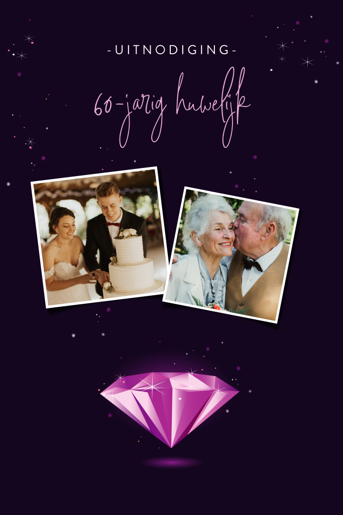 Op zoek naar een chique uitnodiging om jullie 60-jarig huwelijksjubileum te vieren? Wat dachten jullie van deze kaart met paar/roze diamant op een dieppaarse achtergrond. Pas zelf de tekst aan in de designtool en plaats twee mooie foto's.