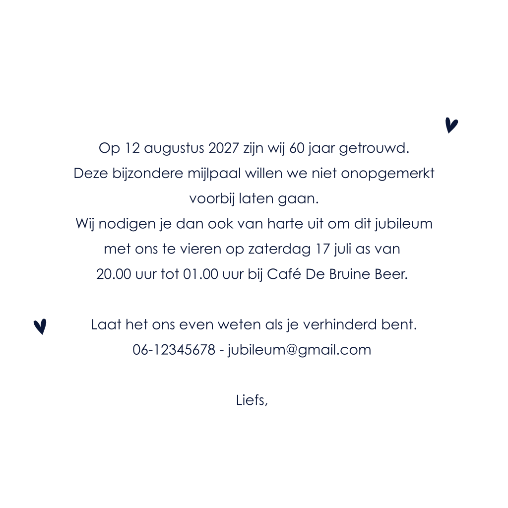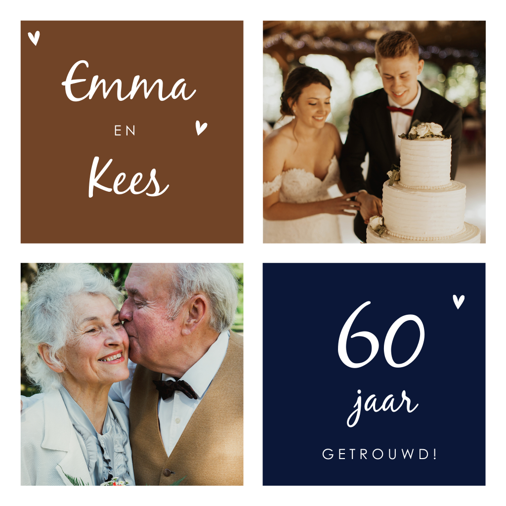 Jullie zijn 60 jaar getrouwd! Wat een bijzondere mijlpaal en die wil je natuurlijk vieren. Kies voor deze vrolijke uitnodiging in verschillende kleuren en met ruimte voor twee foto's. Pas zelf de teksten aan in de designtool. Jullie namen en 60 jaar staan in goudfolie en vallen extra op.