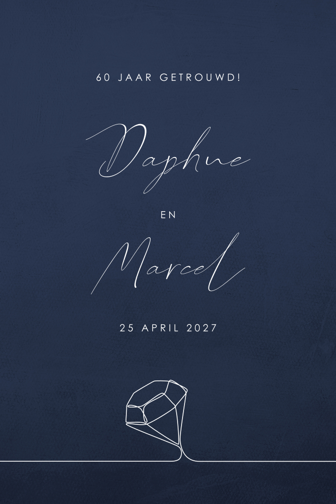 Donkerblauwe uitnodiging voor een 60-jarig huwelijksfeest. 60 jaar huwelijk noemt men ook wel een diamanten huwelijk, vandaar deze mooie goudfolie diamant. Jullie namen staan met een sierlijk lettertype ook in goud. Op de achterzijde is voldoende ruimte voor de overige informatie en twee mooie foto's. Bestel een drukproef en bekijk de kaart in het echt.