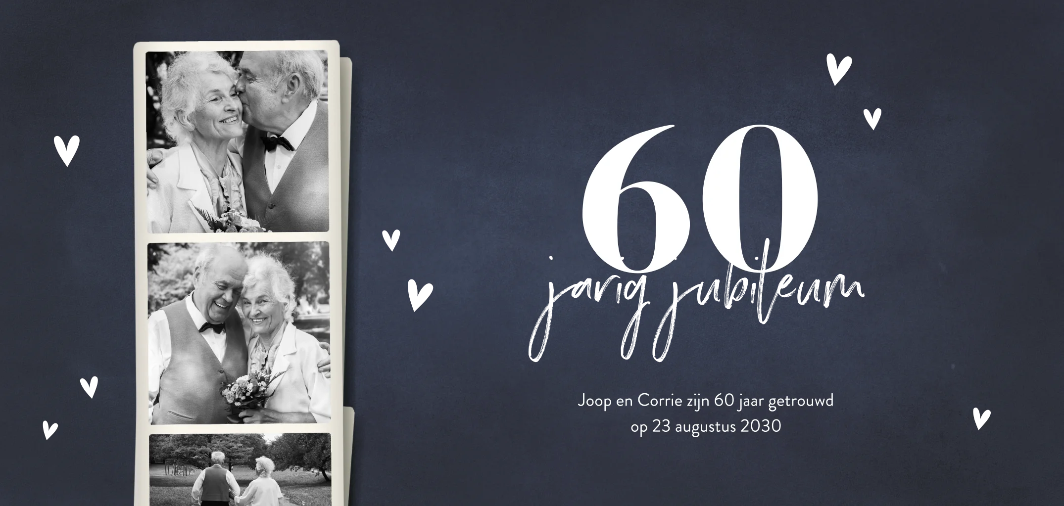 Een mooie, donkerblauwe uitnodiging voor een jubileum van zestig jaar. De kaart heeft ruimte voor drie foto's en wordt verder versierd met koperfolie hartjes. Ook de speelse typografie wordt gedrukt in glimmend koperfolie voor een chique en feestelijk effect. Liever goud- of zilverfolie? Pas deze kaart zelf aan in onze ontwerptool.