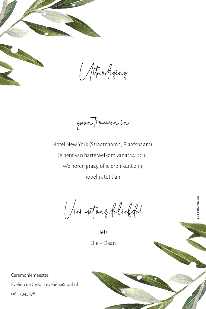 Een chique trouwkaart van echt kalkpapier (200 grams). Dit papier is semi-transparant, dus geeft een heel bijzonder effect aan jullie trouwuitnodigingen. Dit enkele kaartje wordt versierd met groene bladeren en goudfolie spetters. Plaats jullie eigen gegevens en info over de bruiloft op de kaart met behulp van onze handige editor.