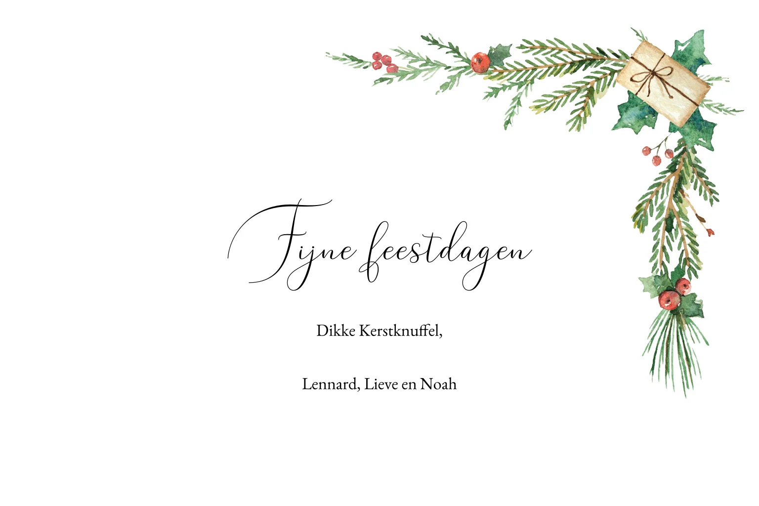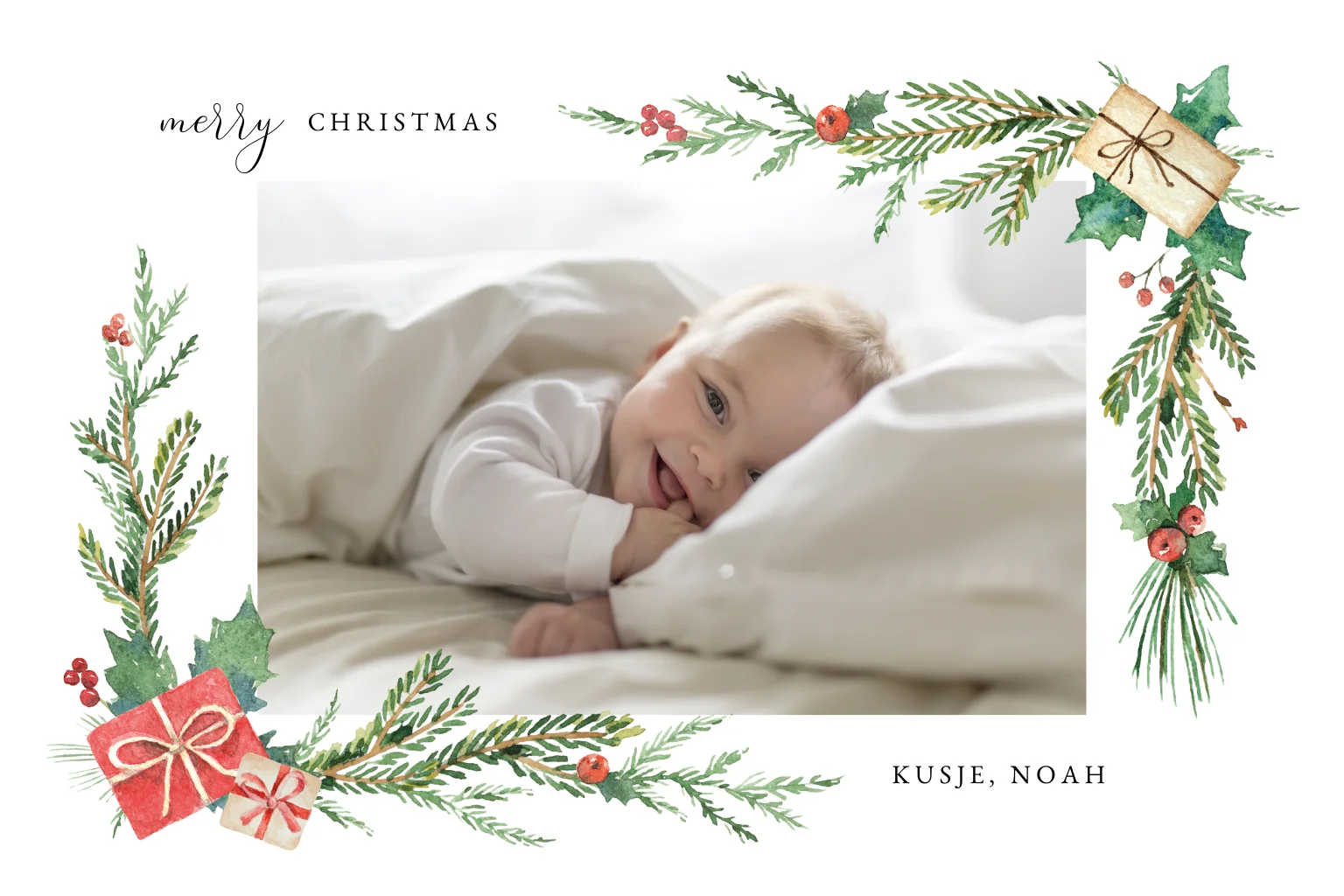 Wil jij de eerste kerst van je kindje met je vrienden en familie delen? Verstuur dan baby's first Christmas kerstkaarten. Dit chique ontwerp heeft een fotokader versierd met waterverf illustraties. Zo zie je onder andere een kerstcadeautje, dennentakken en hulst. Stijlvolle en klassieke lettertypes wisselen elkaar af. Plaats een foto van je kindje om de kaart helemaal af te maken.