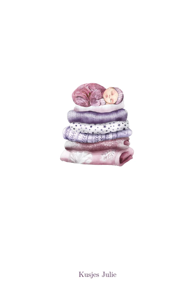 Kerstgroet met thema 'Baby's 1e kerst' voorzien van een lieve waterverf illustratie. Op de afbeelding is een stapel knusse dekens te zien, waarop een vredig slapend baby meisje rust. Eronder staat de toepasselijke 'Warm Wishes'. Deze tekst, gedrukt in roségoudfolie, kun je moeiteloos aanpassen met behulp van de editor. De achterzijde van de kaart biedt voldoende ruimte voor een prachtige foto van jullie dochter, of een beeld van jullie samen.