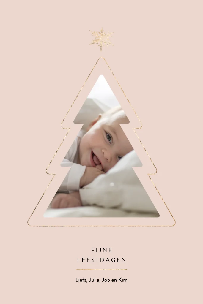 Roze kerstkaart met goudkleurig fotokader kerstboom met sneeuwster. Chique kerstkaart met zachtroze achtergrond en een fotokader in de vorm van een kerstboom. De roze kleur en de goudkleurige accenten matchen erg goed bij elkaar. Liever een andere achtergrondkleur? Dat kan, neem dan even contact met ons op. In het kader kun je een mooie foto van je pasgeboren dochtertje kwijt.