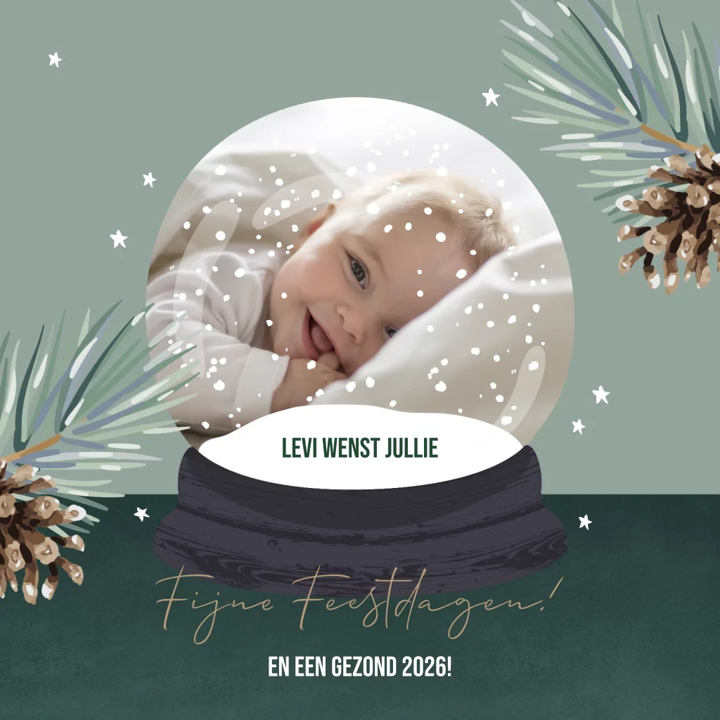 Vrolijke kerstkaart met babyfoto in sneeuwbol en dennentakjes. Op zoek naar een grappige kerstkaart om de eerste kerst van je kleintje met de wereld te delen? Dit vrolijke kaartje heeft een illustratie van een sneeuwbol. Hier kun je een foto plaatsen. Pas de lettertypes en tekst naar wens aan.