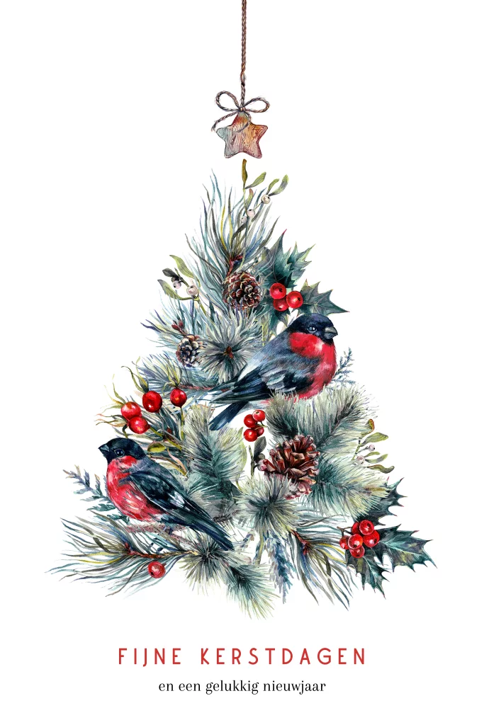 Sfeervolle kerstkaart met aquarel kerstboom gemaakt van naaldtakken, dennenappels, meidoorn, hulstbes en maretak, goudvinken en houten sterhanger. De kaart is in een vintage-stijl. U kunt de tekst eenvoudig aanpassen met de editor.