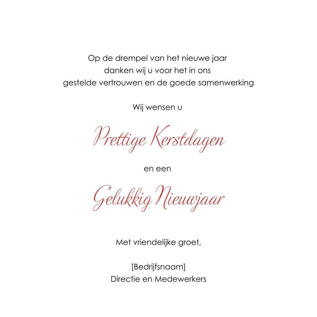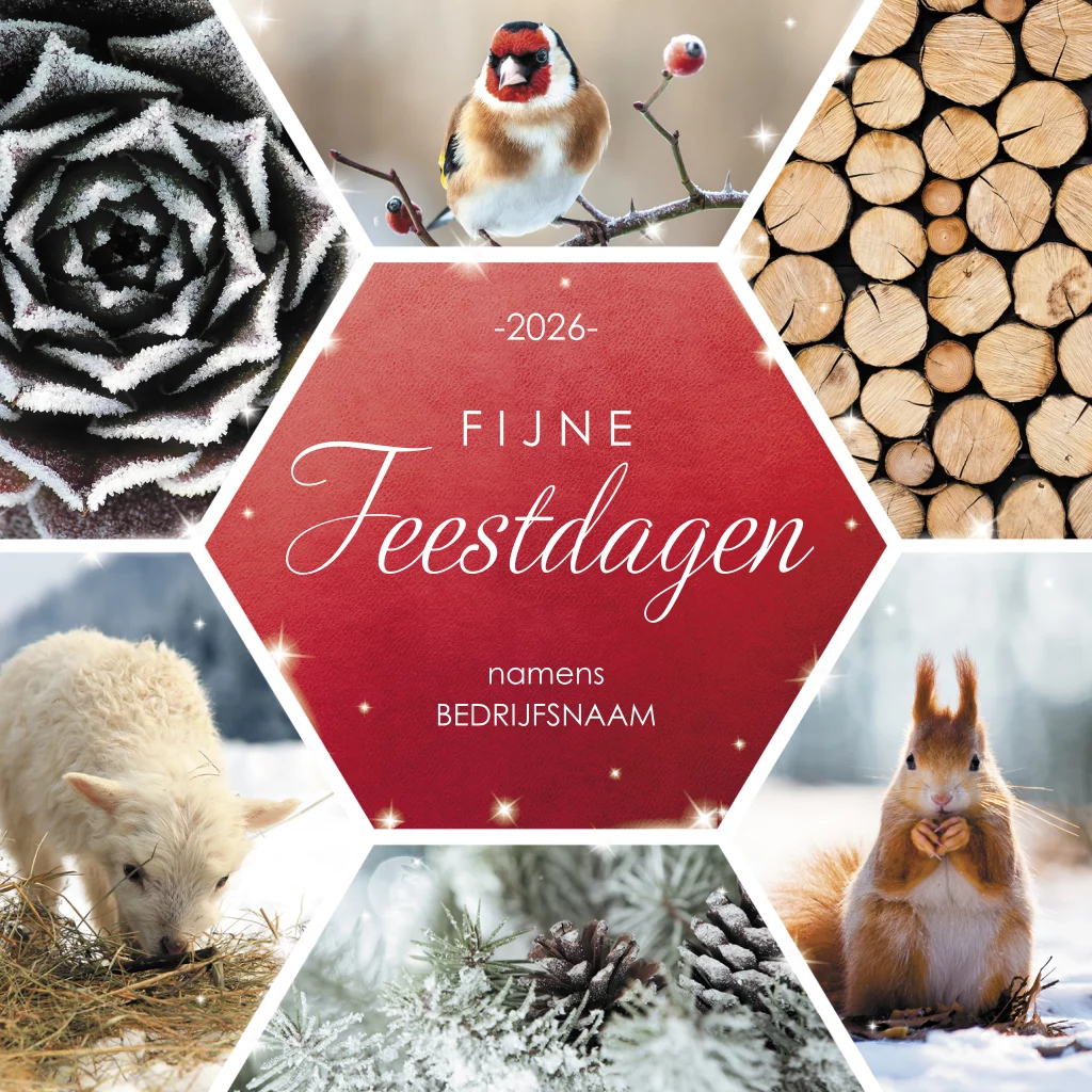Zakelijke kerstkaart met een fotocollage van 6 sfeervolle, winterse natuurfoto's. In het midden een rode zeshoek met je kerstwens. Pas het ontwerp naar wens aan en bestel een drukproef.
