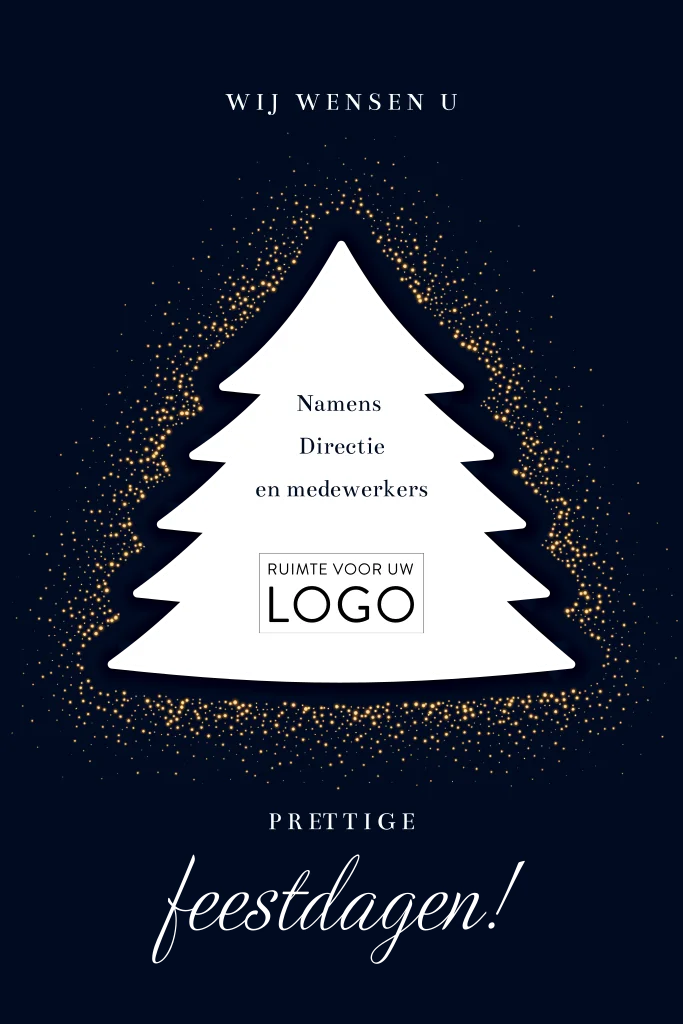 Prachtig diepblauwe kerstkaart, met een schitterende grote kerstboom in glinsterend goudfolie, omgeven door sprankelende gouden glitters. In het midden van de kerstboom kun je je logo plaatsen.