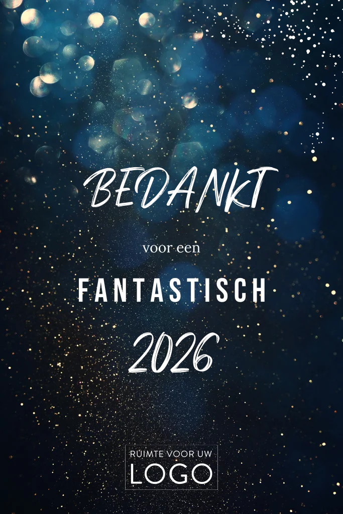 Deze stijlvolle bedank-kerstkaart heeft een donkerblauwe achtergrond met de boodschap "Bedankt voor een fantastisch 2026" in glanzende goudfolie. De kaart straalt waardering uit, perfect om zakelijke relaties te bedanken voor een succesvol jaar. De tekst is volledig aanpasbaar in de editor, zodat u een eigen boodschap kunt toevoegen. Onderaan is er ruimte om uw eigen logo te uploaden.
