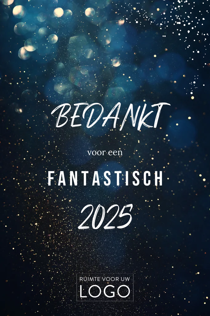 Deze stijlvolle bedank-kerstkaart heeft een donkerblauwe achtergrond met de boodschap "Bedankt voor een fantastisch 2025" in glanzende goudfolie. De kaart straalt waardering uit, perfect om zakelijke relaties te bedanken voor een succesvol jaar. De tekst is volledig aanpasbaar in de editor, zodat u een eigen boodschap kunt toevoegen. Onderaan is er ruimte om uw eigen logo te uploaden.