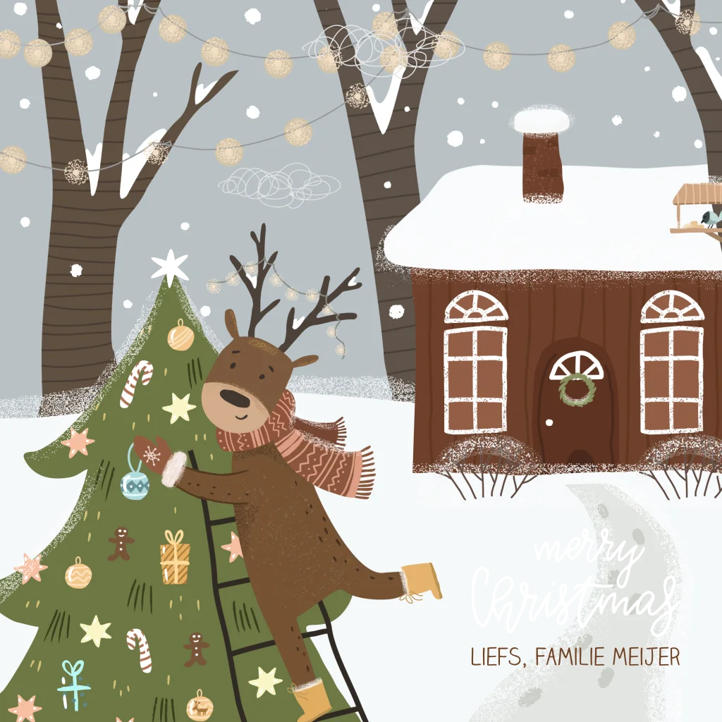 Vrolijke kerstkaart met een illustratie van een rendier die een kerstboom versiert in een winters landschap. De goudfolie tekst en ster maken dit tot een feestelijk kaartje. Stuur deze leuke kerstkaart naar familie en vrienden om ze een fijne kerst toe te wensen op een persoonlijke manier!