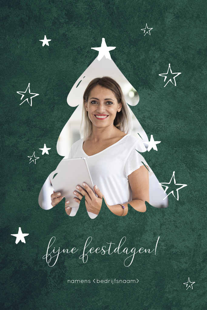 Deze stijlvolle zakelijke kerstkaart heeft een achtergrond in een diep groene tint, met een fotokader dat de vorm aanneemt van een kerstboom. Hierin kunt u een prachtige foto toevoegen om de kaart een persoonlijke touch te geven. De toegevoegde sterren in glanzend goudfolie vormen een schitterend accent rondom de foto en voegen een feestelijke uitstraling toe aan de kaart.