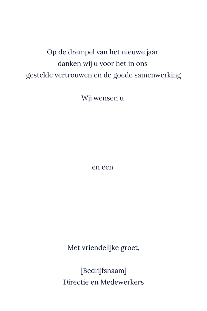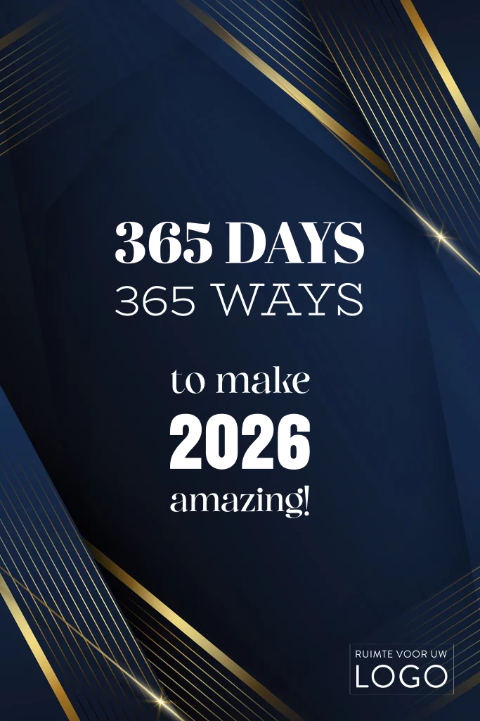 Mooie diepblauwe nieuwjaarskaart met stijlvolle gouden accenten en de inspirerende boodschap: "365 Days, 365 Ways to make 2026 amazing!" Het ontwerp straalt luxe uit en biedt ruimte voor het uploaden van uw bedrijfslogo. Perfect voor zakelijke relaties, deze kaart motiveert en inspireert, terwijl het een professionele uitstraling behoudt. De tekst kan eenvoudig worden aangepast in de editor, zodat u uw eigen nieuwjaarswens kunt toevoegen. Een perfecte manier om klanten en partners een fantastisch 2026 te wensen.
