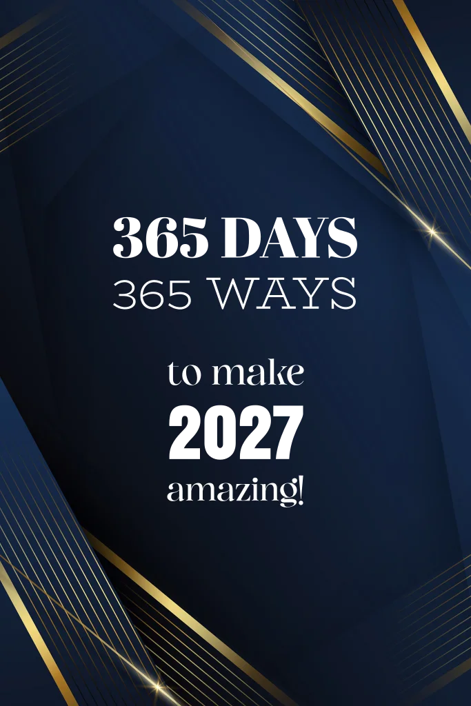 Mooie diepblauwe nieuwjaarskaart met stijlvolle goudfolie accenten en de inspirerende boodschap: "365 Days, 365 Ways to make 2027 amazing!" De tekst kan eenvoudig worden aangepast in de editor, zodat je je eigen nieuwjaarswens kunt toevoegen. Een perfecte manier om vrienden en familie een fantastisch 2027 te wensen.