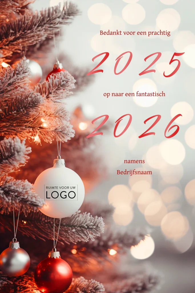 Verstuur feestelijke nieuwjaarswensen naar uw zakelijke relaties of medewerkers met deze stijlvolle kerstkaart. Op de kaart staat een foto van een prachtige kerstboom met rode kerstversiering. Op de witte kerstbal is ruimte voor uw eigen logo. Personaliseer de kaart eenvoudig met uw eigen teksten in onze gebruiksvriendelijke editor, en maak de feestdagen nog specialer!