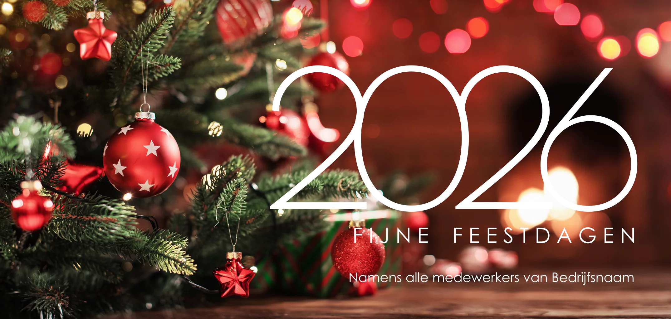 Stijlvolle kerstkaart voor 2026 met roségoudfolie accenten en een prachtige close-up van een kerstboom met rode kerstballen. Geef dit jaar een vleugje elegantie aan uw kerstgroet met onze roséfolie-ontwerpen, waarin u uw logo en een persoonlijke boodschap kunt toevoegen.
