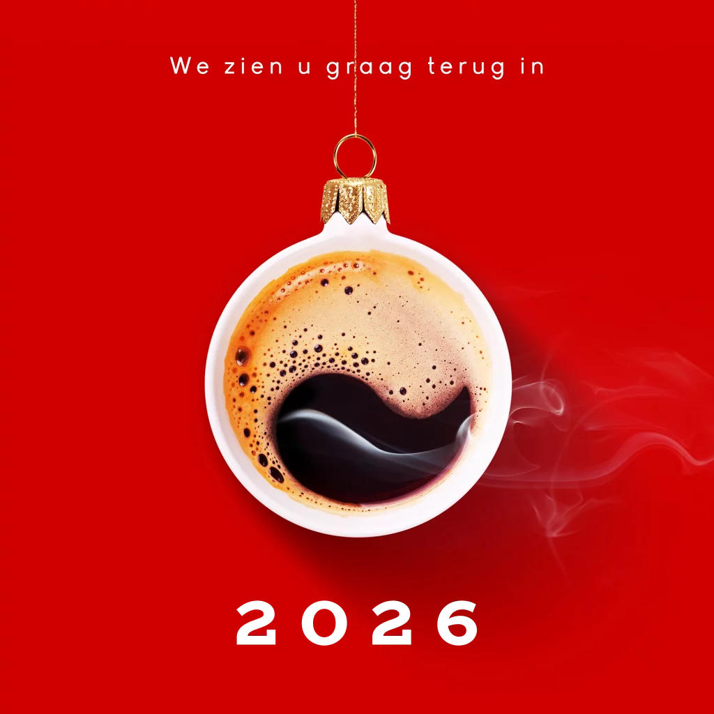 Zakelijke kerstkaart met een opvallend design: een kopje koffie op een rode ondergrond is vormgegeven als een kerstbal, met een goudkleurige hanger. Boven het kopje staat de tekst "We zien u graag terug in" en onder het kopje het jaartal "2026" in gouden cijfers. Pas de kaart eenvoudig aan met onze kaarteneditor en bestel een proefje.