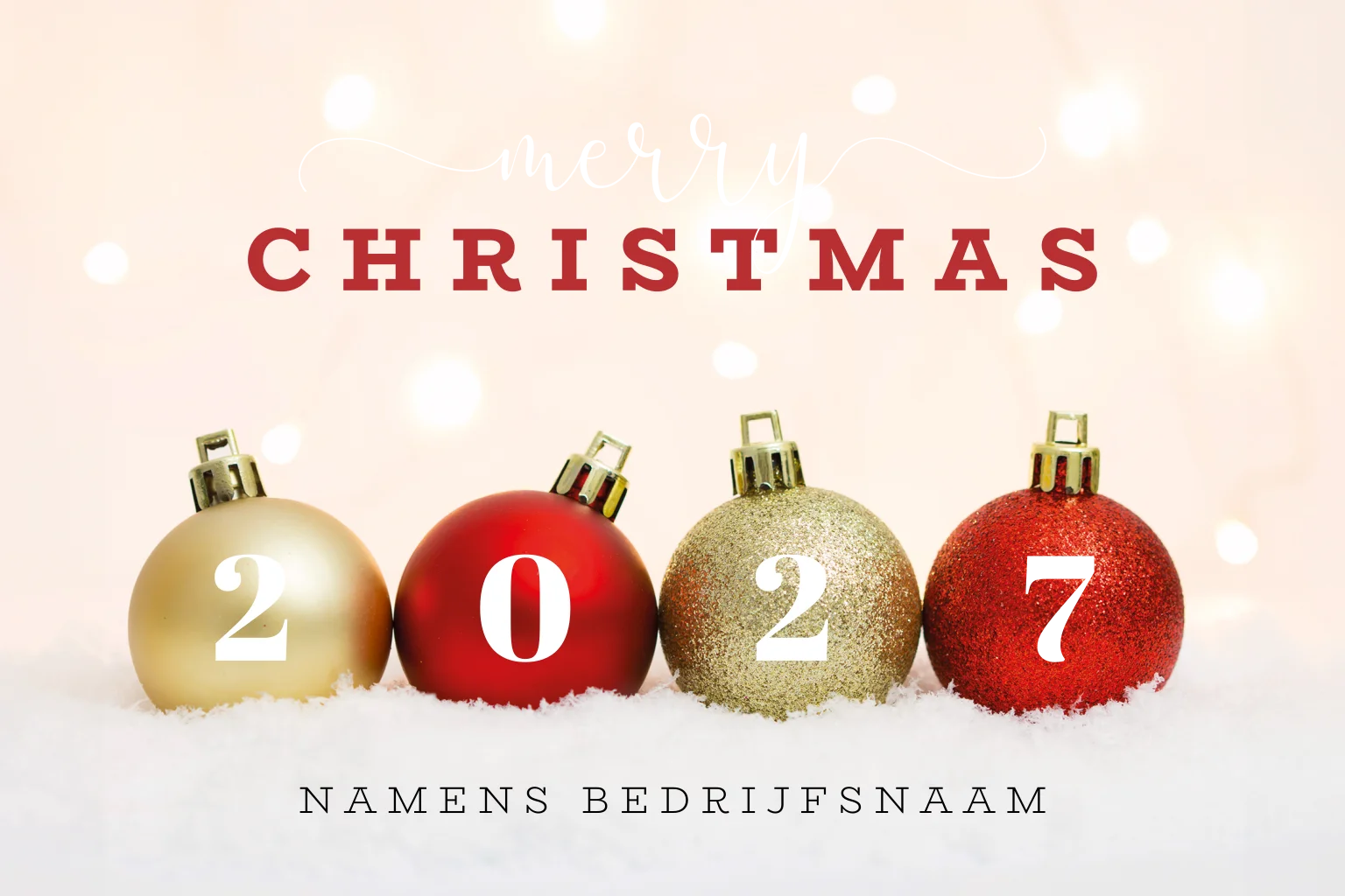 Feestelijke kerstkaart met rode en gouden kerstballen rustend in de sneeuw. Op elke bal staat een cijfer dat samen het jaartal 2027 vormt, met in totaal vier ballen. Het laatste cijfer '7' is gedrukt met prachtig goudfolie. Personaliseer deze kerstkaart naar uw voorkeur en bestel een proefdruk.