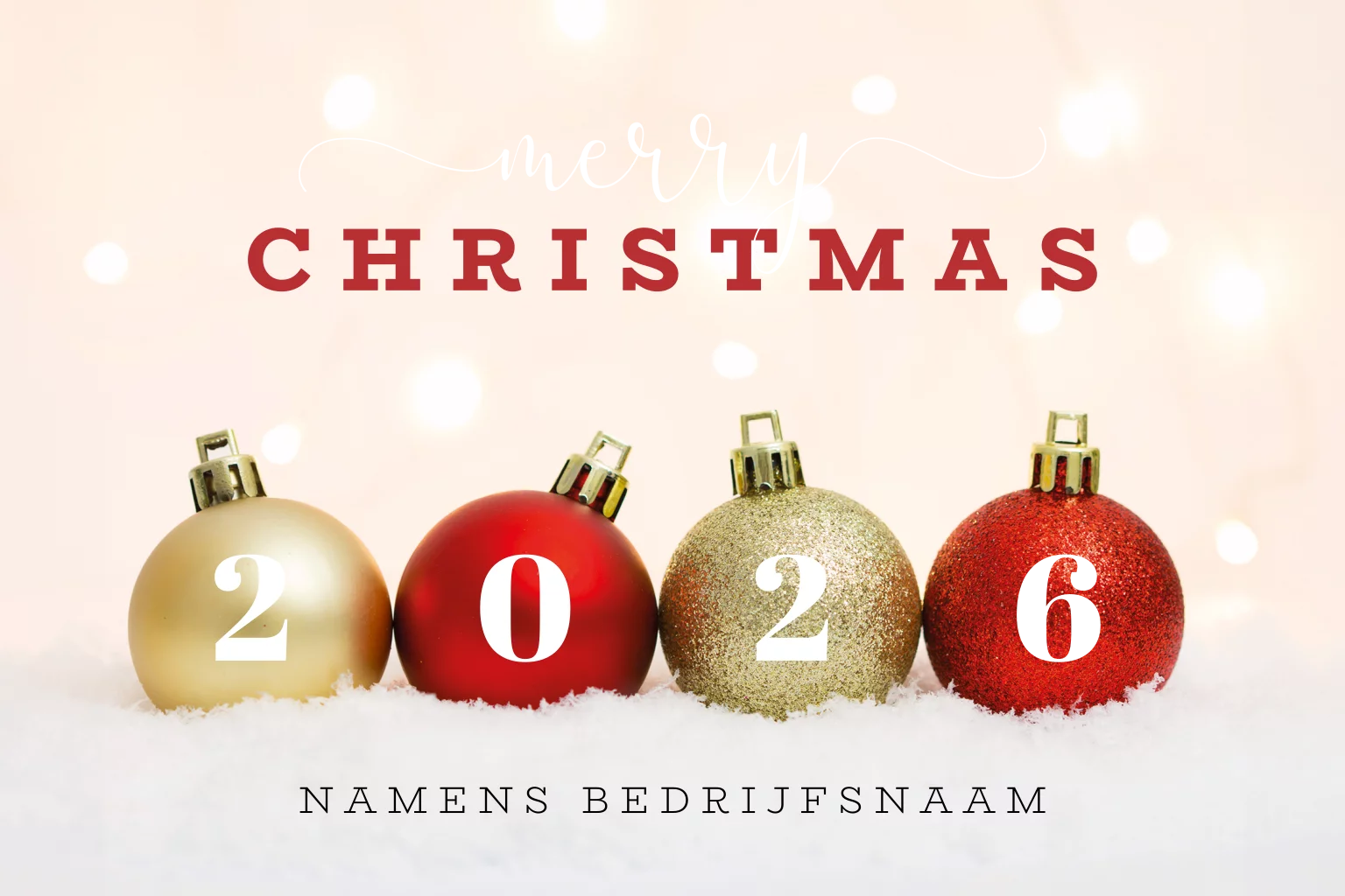 Feestelijke kerstkaart met rode en gouden kerstballen rustend in de sneeuw. Op elke bal staat een cijfer dat samen het jaartal 2026 vormt, met in totaal vier ballen. Het laatste cijfer '6' is gedrukt met prachtig goudfolie. Personaliseer deze kerstkaart naar uw voorkeur en bestel een proefdruk.