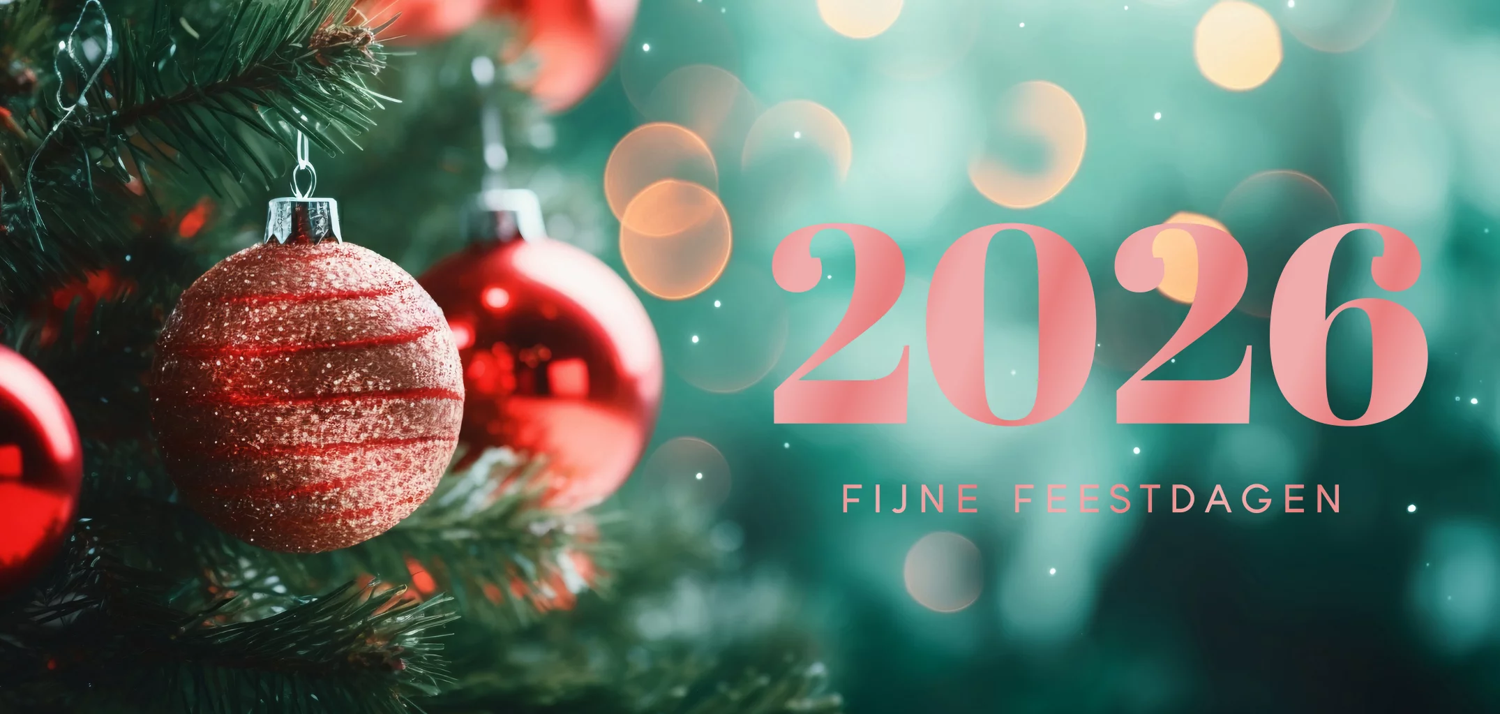 Sfeervolle kerstkaart met close-up van een kerstboom met rode kerstballen en blauwe achtergrond. Rechts staat in het groot 2026 in hoogglans roze. U kunt de tekst eenvoudig aanpassen in de editor.