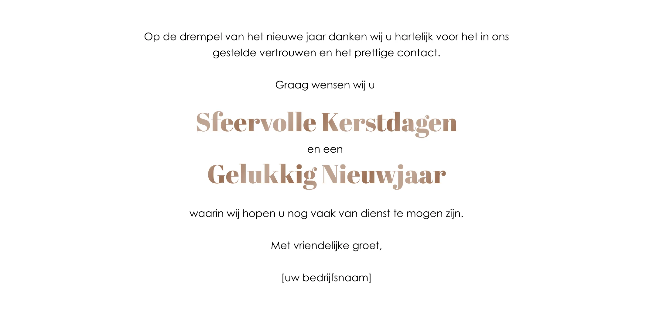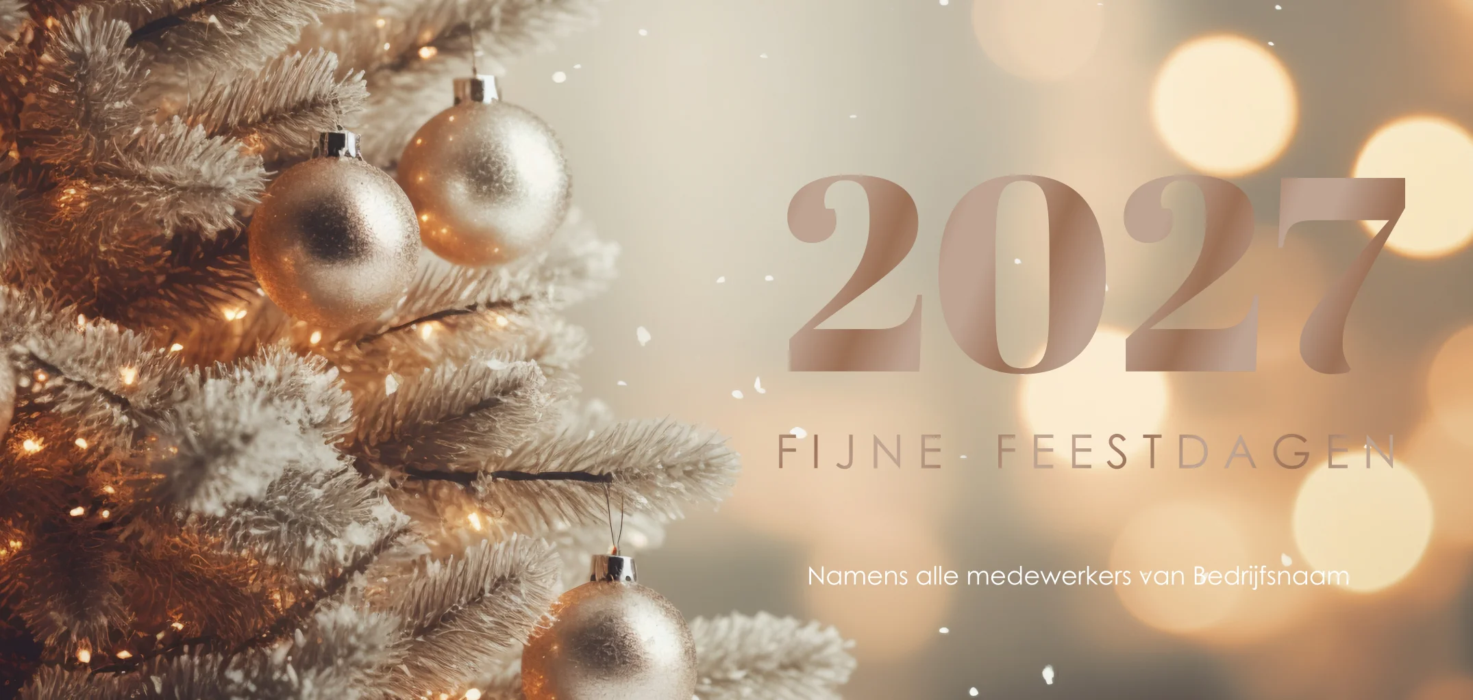 Stijlvolle kerstkaart met close-up van een kerstboom met goudkleurige kerstballen. Rechts staat in het groot 2027 in hoogglans roestbruin. Aan de binnenzijde maar ook voorop is ruimte voor een logo en een persoonlijke boodschap welke u in de editor kunt plaatsen.