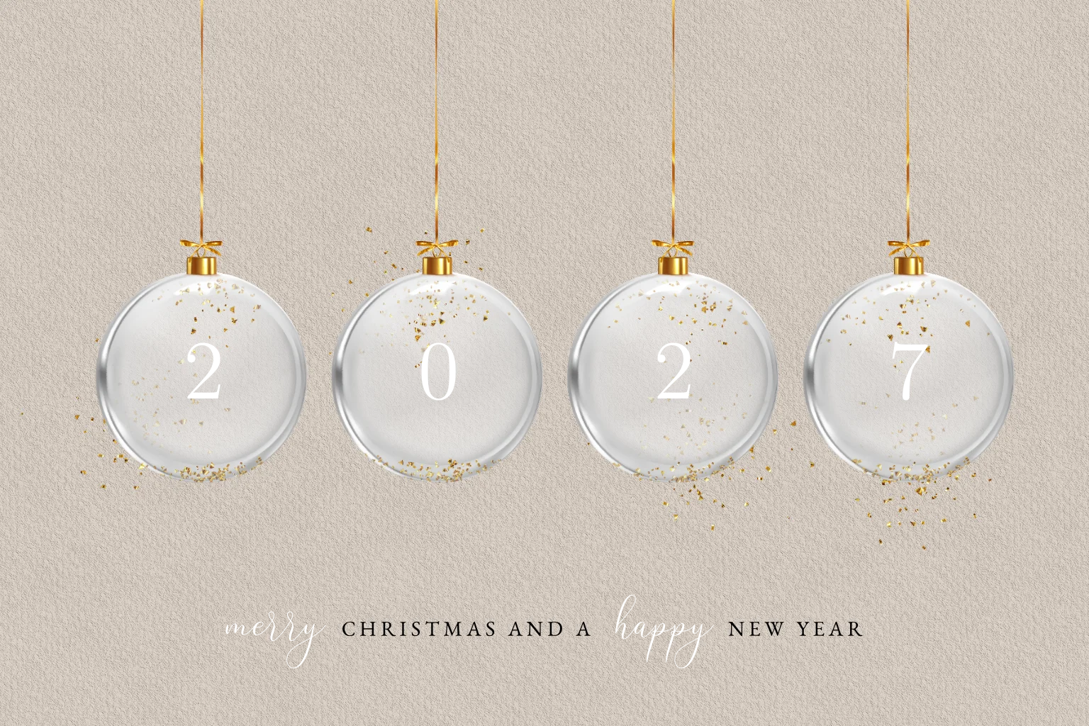 Chique kerstkaart met transparante kerstballen, subtiel gevuld met gouden glitters en het jaartal 2027 in stijlvolle typografie. De neutrale achtergrond en gouden accenten geven de kaart een luxe uitstraling. Personaliseer eenvoudig in de editor voor een verfijnde kerst- en nieuwjaarsgroet.