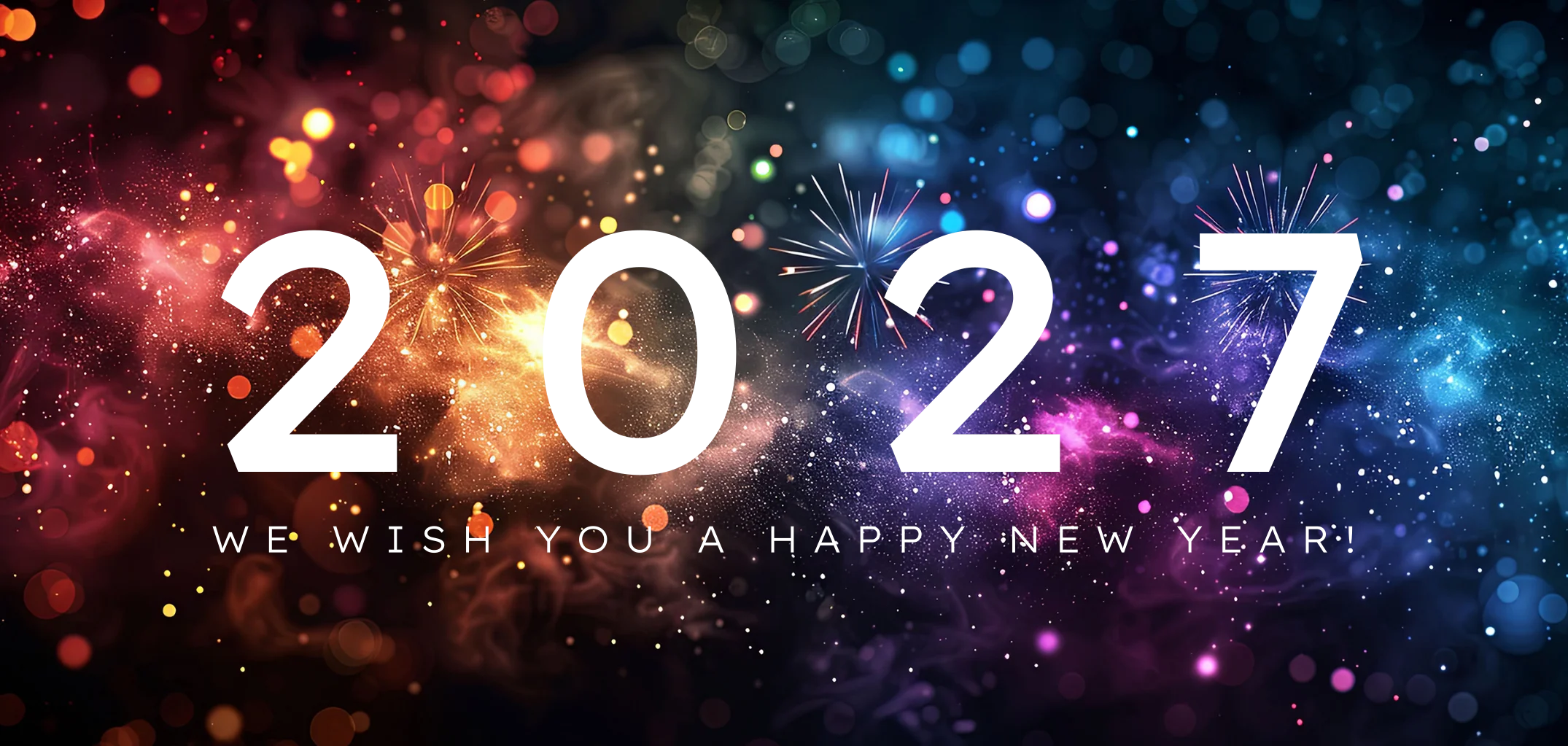 Deze sprankelende nieuwjaarskaart heeft een kleurrijke achtergrond vol vuurwerk in regenboogkleuren, met de jaartal "2027" opvallend gedrukt in luxe goudfolie. De wens "We wish you a happy new year!" maakt het een perfecte keuze voor een feestelijke start van het jaar. Deze tekst kunt u eenvoudig wijzigen in de editor. Ideaal voor zakelijke relaties, met een chique en opvallende uitstraling. In de kaart is ruimte voor het logo en een persoonlijke tekst.