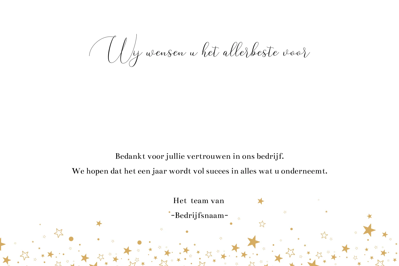 Donkerblauwe kerst- en nieuwjaarskaart met een stijlvolle uitstraling door de gouden sterren in combinatie met de blauwe achtergrond. Het jaartal "2026" is met goudfolie gedrukt. De boodschap "Samen op weg naar een succesvol 2026" maakt deze kaart ideaal voor zakelijke relaties. Onderaan is ruimte voor het toevoegen van een logo. U kunt de kaart eenvoudig bewerken met de kaartenmaker. Bestel een drukproef om het design eerst in het echt te zien.