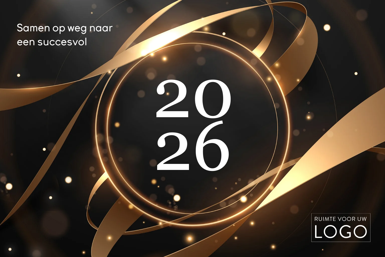 Elegante zakelijke kerstkaart met een chique zwart-gouden ontwerp met het jaartal "2026" gedrukt in luxe goudfolie. Het jaartal is omringd met glinsterende lichtaccenten en goudkleurige linten. De kaart bevat de boodschap "Samen op weg naar een succesvol 2026," die eenvoudig aan te passen is met de editor. Voeg uw eigen logo toe voor een gepersonaliseerde, professionele uitstraling. Ideaal om zakelijke relaties op stijlvolle wijze fijne feestdagen en een succesvol nieuwjaar te wensen. Perfect voor bedrijven die op zoek zijn naar een luxe, op maat gemaakte kaart.