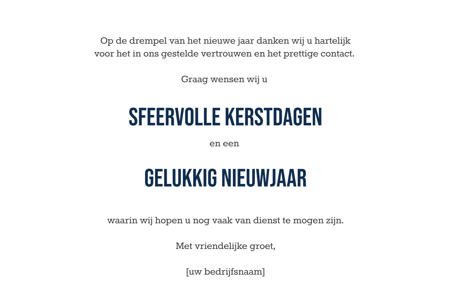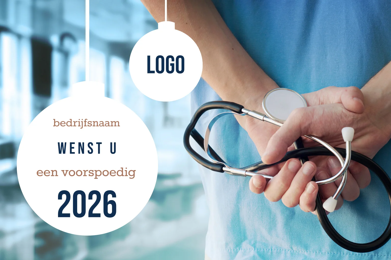 Liggende, dubbele kerstkaart met witte kerstballen, waarin een de nieuwjaarswens en uw bedrijfslogo staan. Op de achtergrond zie je een foto van een arts die een stethoscoop draagt. De foto kan ook vervangen worden door een eigen foto en natuurlijk kunt u ook de teksten zelf aanpassen met onze designtool.