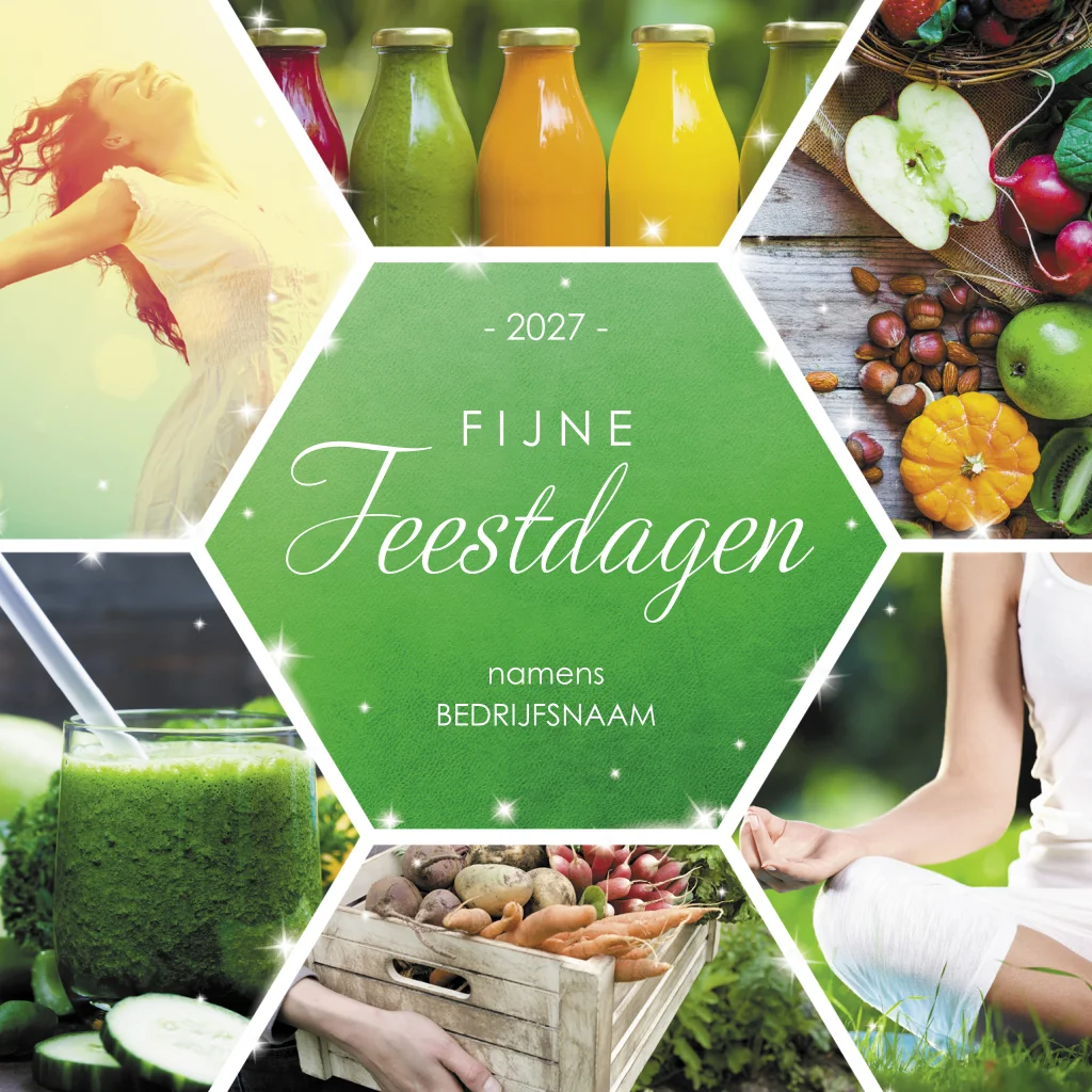 Zakelijke kerstkaart met een fotocollage van 6 foto's die met gezonde voeding te maken hebben, denk aan verse groeten, gezonde sapjes maar ook mentale gezondheid. In het midden een groene zeshoek met je kerstwens. Pas het ontwerp naar wens aan en bestel een drukproef.