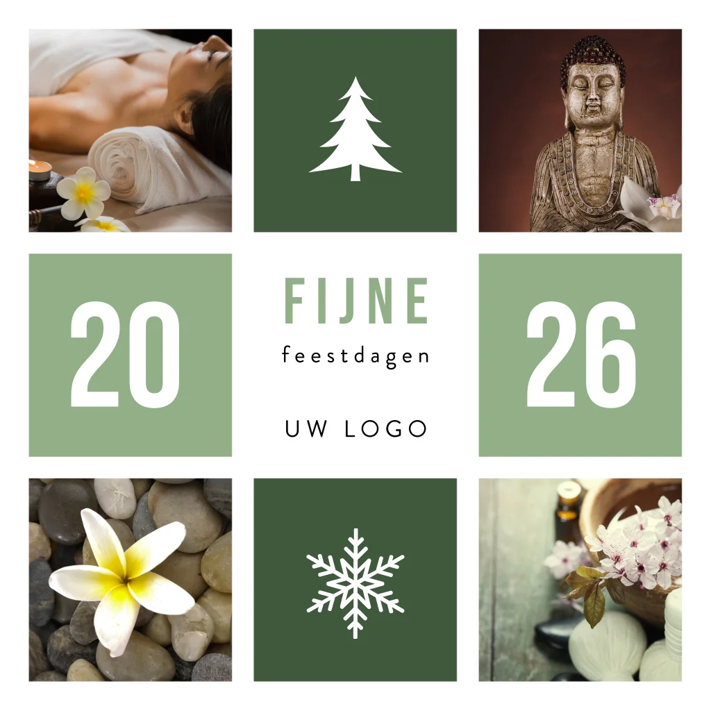Deze moderne kerstkaart is in 9 vakken verdeeld. De hoofdkleur is groen maar kun je wijzigen in een eigen kleur. De foto's van Boeddha, massage etc kun je eventueel ook door eigen foto's vervangen. Pas de kaart naar eigen wens aan.