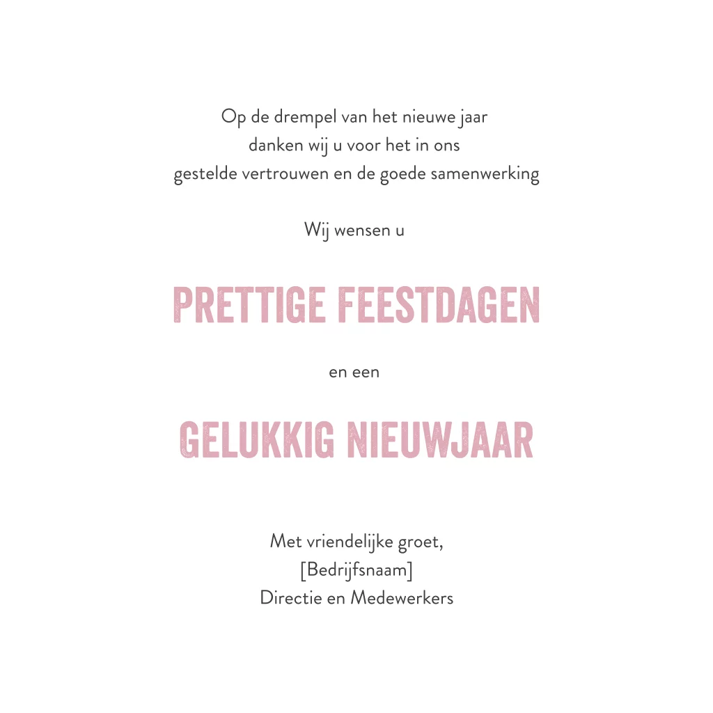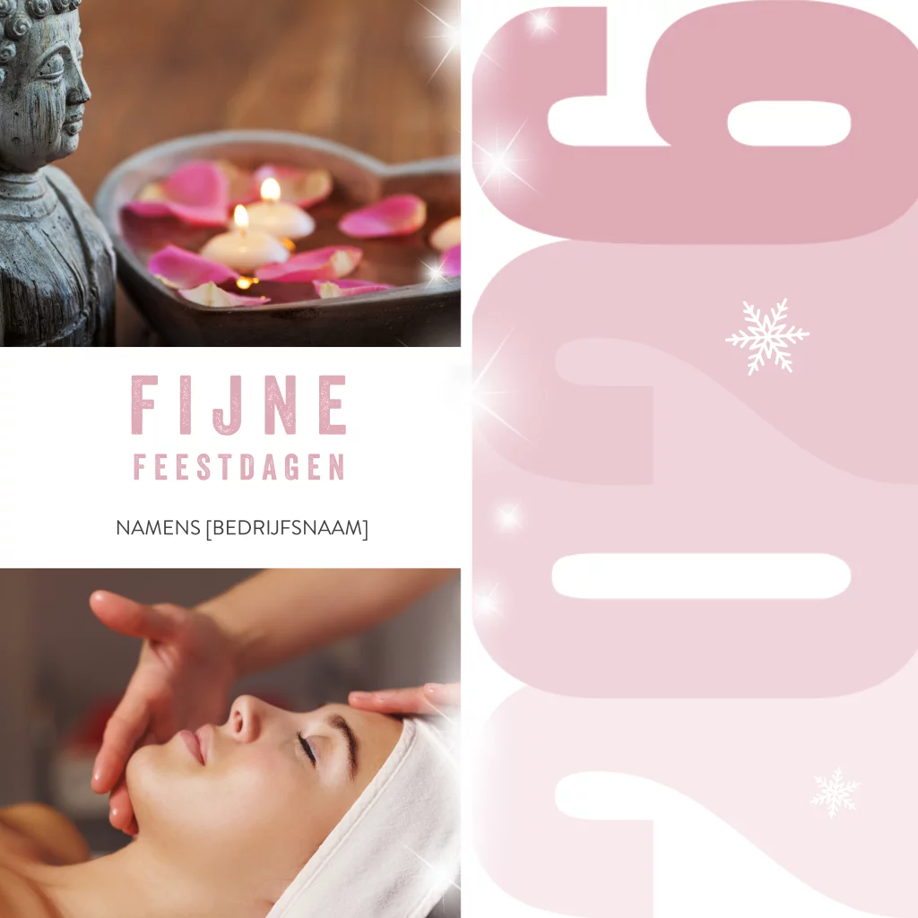 Mooie, vierkante kerstkaart met verschillende vlakken en foto's van wellness. Met deze kaart kun je alle zakenrelaties, klanten en medewerkers een ontspannen 2026 wensen. Maak de kaart extra persoonlijk door de foto's, kleuren en lettertypes te wijzigen. Is je ontwerp naar wens? Bestel dan een proefdruk.