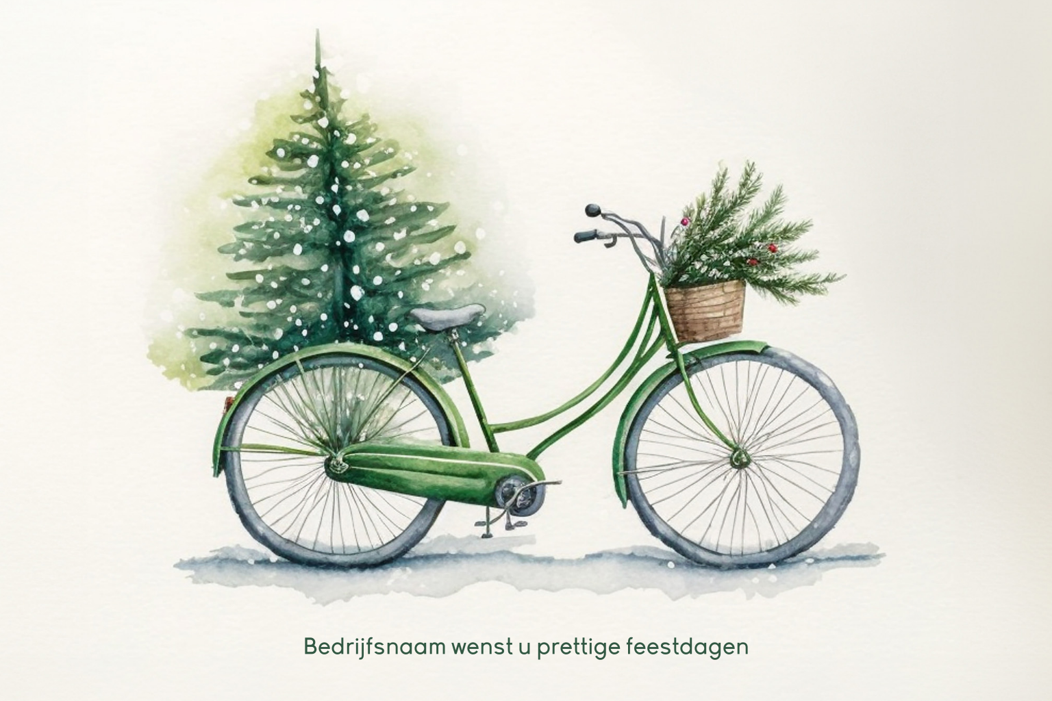 Dat Nederland een echt fietsland is, dat is bijna overal ter wereld wel bekend. Er zijn in Nederland ook meer fietsen als dat er mensen wonen, in totaal 23 miljoen fietsen. Dus een kerstkaart met fiets is dan ook heel toepasselijk voor ons land. Kies deze groene fiets heeft een kerstboom eop de achtergrond en in in het mandje nog kersttakken.
