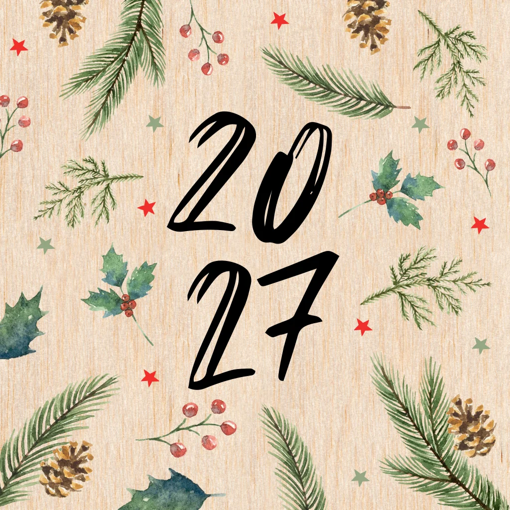 Wens uw zakelijke contacten prettige feestdagen en een gelukkig nieuwjaar op een originele manier met dit houten kerstkaartje. Op de voorkant staat het jaartal 2027 met daaromheen hulst, takjes en sterren. Pas dit ontwerp zelf aan in onze ontwerptool.