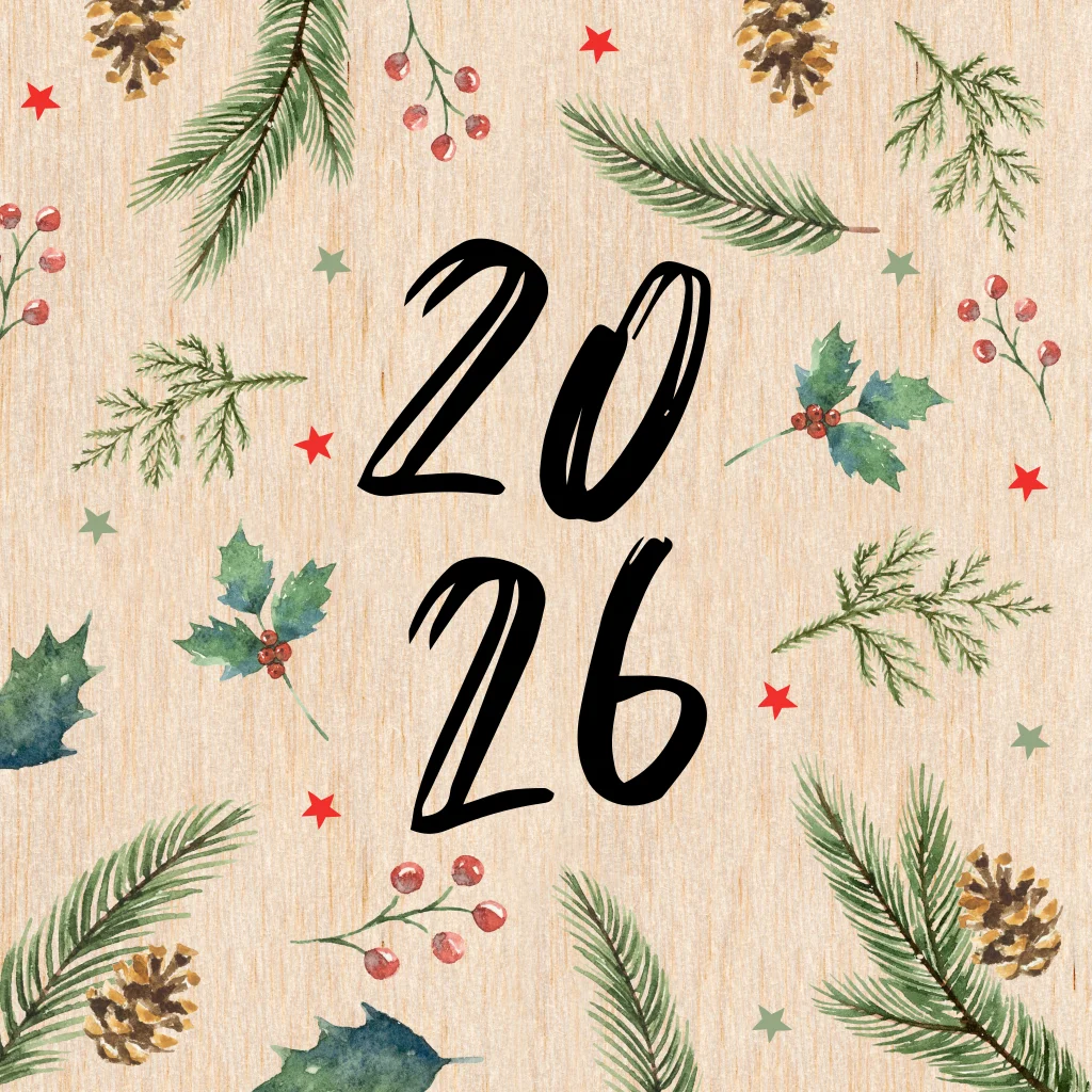 Wens uw zakelijke contacten prettige feestdagen en een gelukkig nieuwjaar op een originele manier met dit houten kerstkaartje. Op de voorkant staat het jaartal 2026 met daaromheen hulst, takjes en sterren. Pas dit ontwerp zelf aan in onze ontwerptool.
