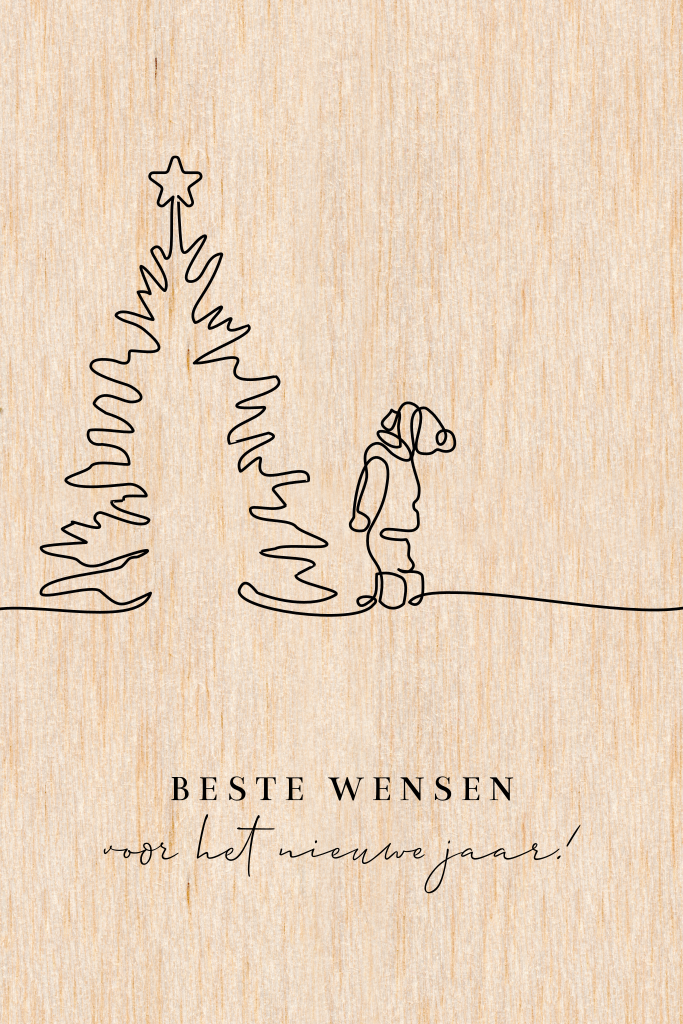 Een lief kerstkaartje, gedrukt op echt hout. Op de voorkant staat een oneline illustratie van een kindje dat naar een kerstboom kijkt. Pas de teksten zelf aan in onze ontwerptool om er een persoonlijk kaartje van te maken.