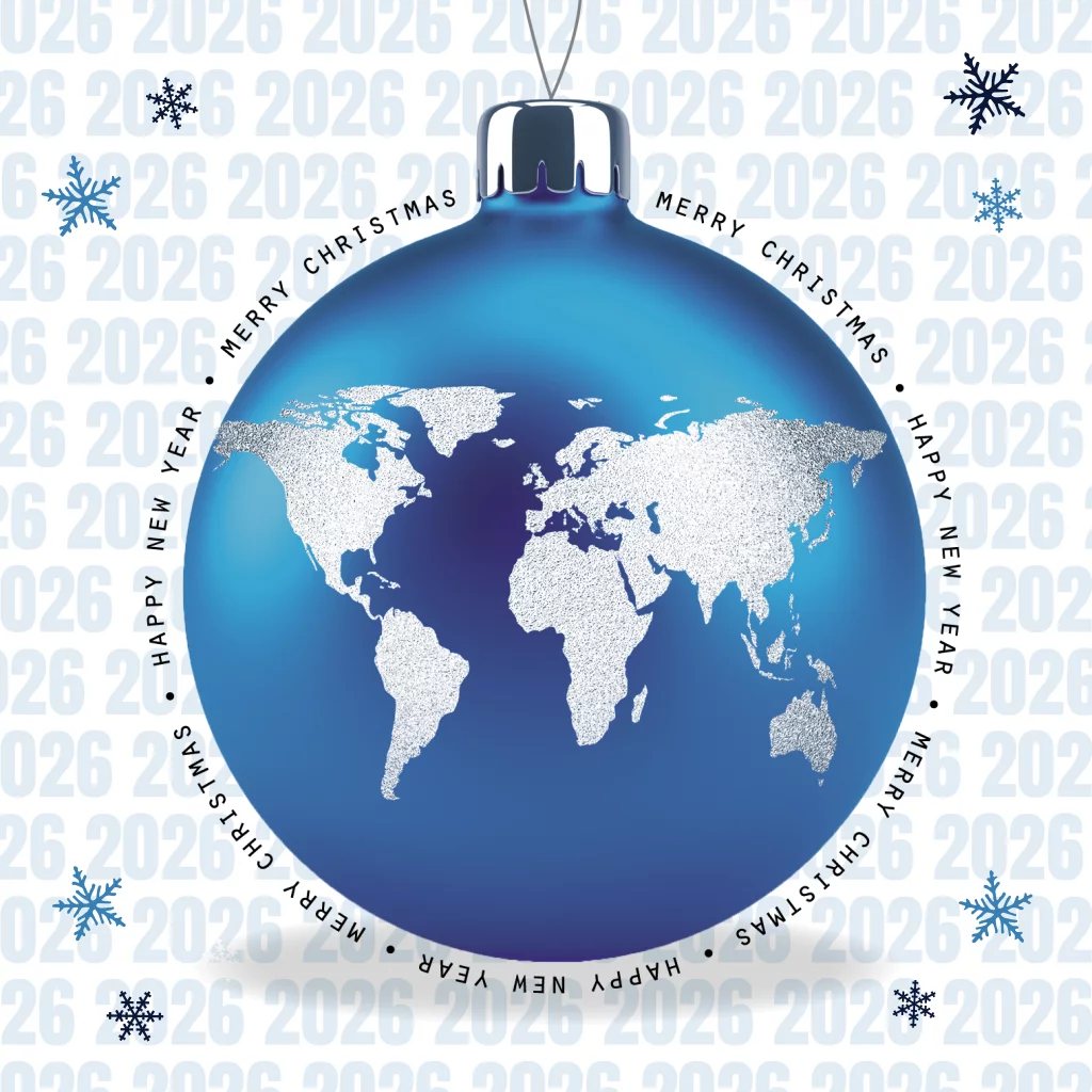 Internationale kerstkaart met de wereldkaart op een blauwe kerstbal. Om de kerstbal staat de tekst Merry Christmas en Happy New Year. Op de achtergrond staat 2026.