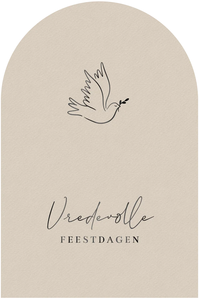 Een Christelijke kerstkaart met beige achtergrond, zwarte hoogglans vredesduif en de tekst 'Vredevolle feestdagen'. De kaart is extra bijzonder door de unieke vorm en de hoogglans afwerking. Pas deze kaart zelf aan in onze editor.